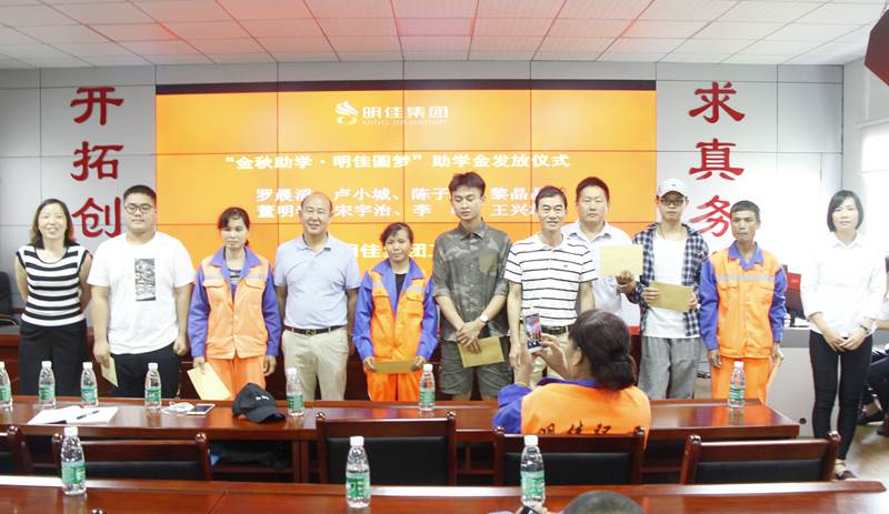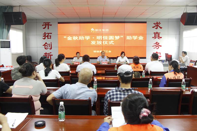 8月28日上午,明佳集團(tuán)工會(huì)“金秋助學(xué)·明佳圓夢”助學(xué)金發(fā)放儀式在集團(tuán)公司三樓會(huì)議室舉行,為8個(gè)考取大學(xué)的職工子女發(fā)放助學(xué)金共計(jì)9600元?偛藐愒啤⒏笨偨(jīng)理鐘寒參加發(fā)放儀式,儀式由工會(huì)主席高斐斐主持。