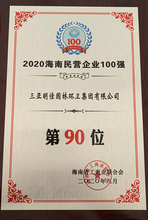 8月28日,“2020海南民營企業(yè)百強(qiáng)發(fā)布會(huì)”在?谂e行。三亞明佳園林環(huán)衛(wèi)集團(tuán)有限公司再次入選“海南民營企業(yè)100強(qiáng)”榜單,名列第90位。